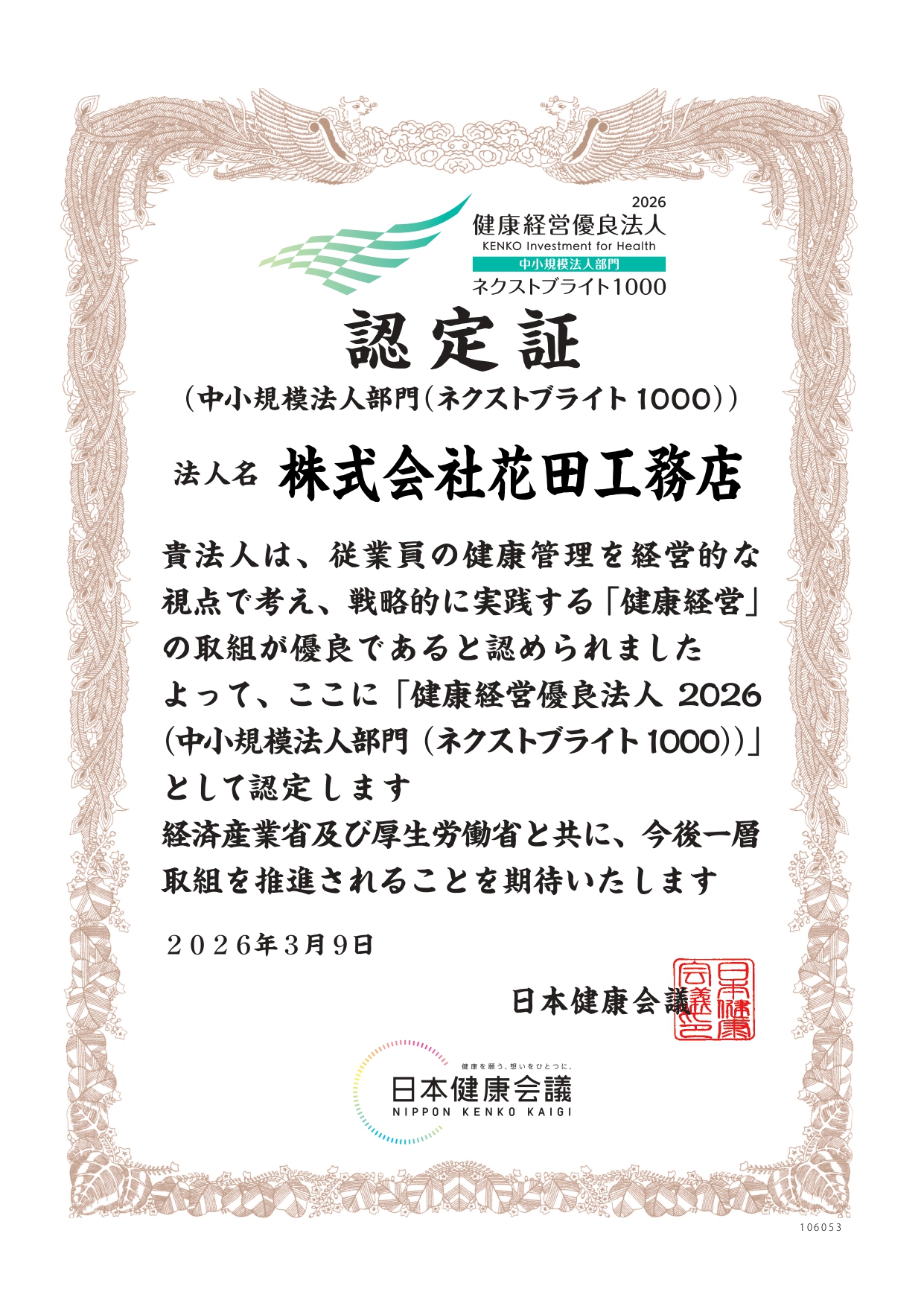 花田工務店は、この度 健康経営優良法人2026(中小規模法人部門)「ネクストブライト1000」に認定されました。
