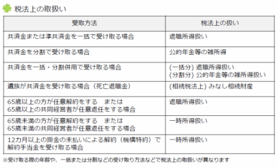 ・解約時の税負担が軽くなります。個人事業主であれば「退職所得」扱いとなり、事業所得と比べて税率が低いため、節税対策になります。